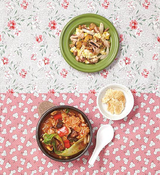 2. 熱鍋中倒入玄米油,放入綜合海鮮、香菇、紅椒、洋蔥、蒜頭和辣椒粉後以小火拌炒,再倒入昆布與水,大火煮滾。湯汁沸騰時,撈出昆布,放入鍋巴,煮10分鐘左右。